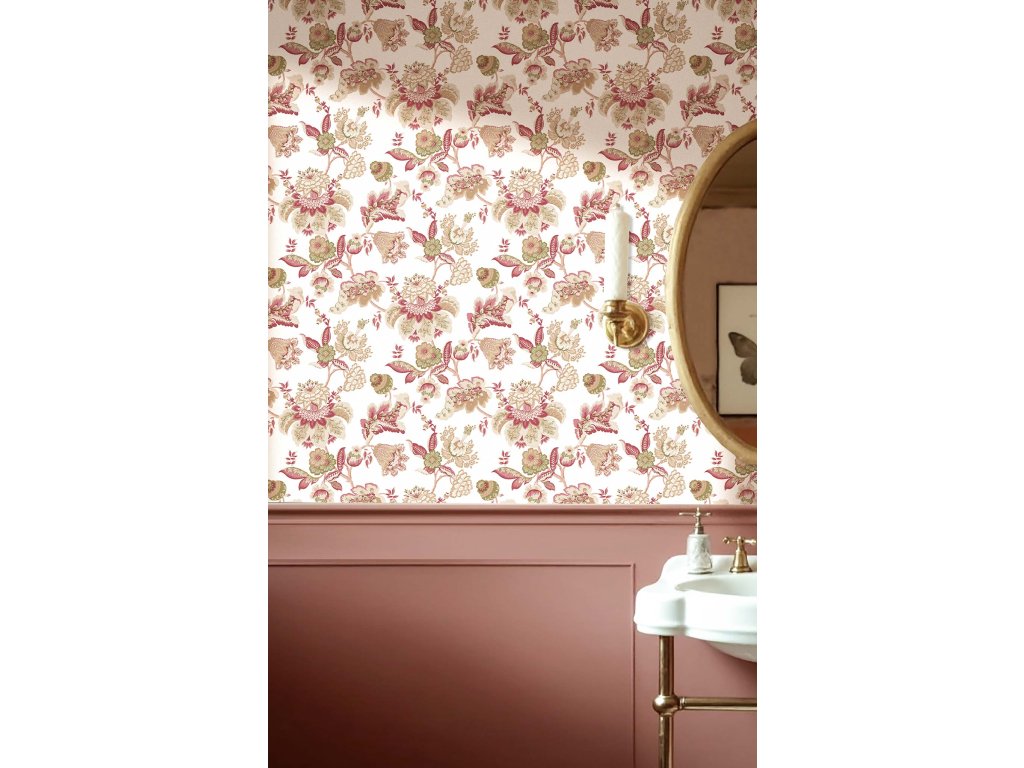 Luxusní vliesová tapeta s vinylovým povrchem, bílý podklad s látkovou texturou, romantický květinový motiv v odstínech vínové, růžové, hnědé, khaki.