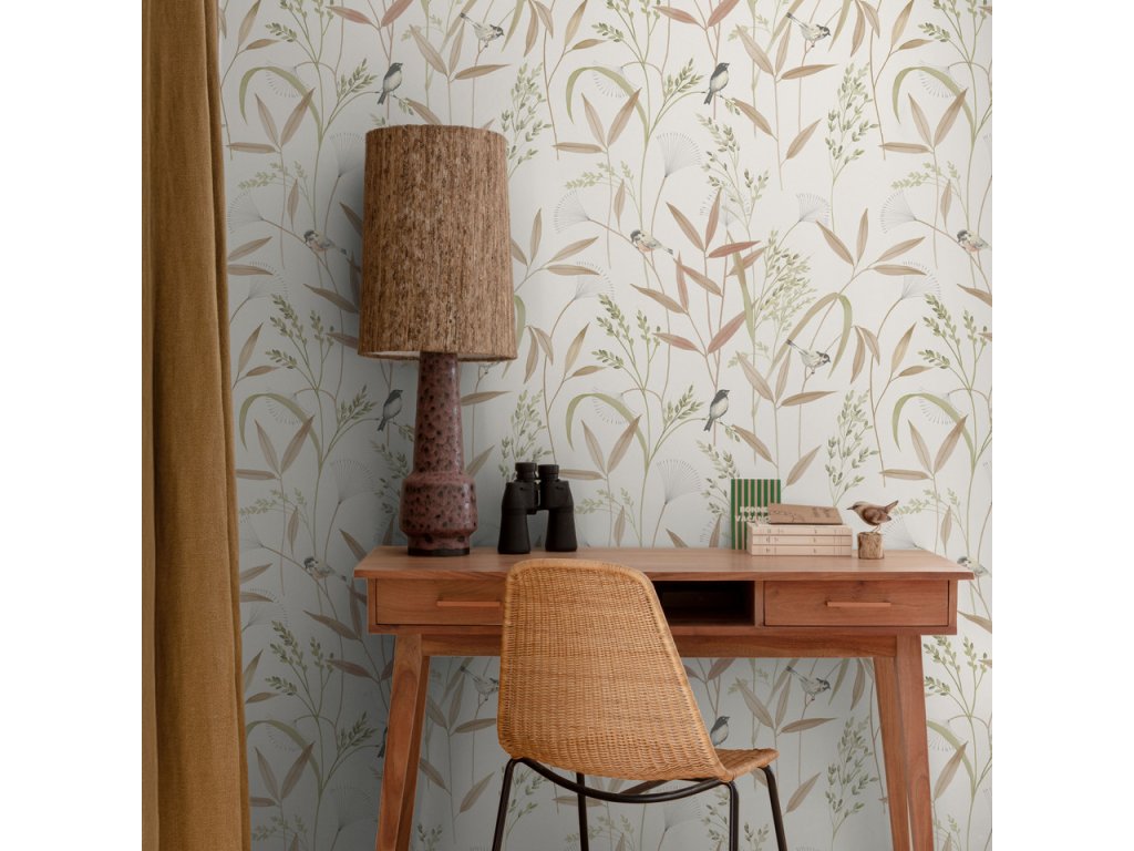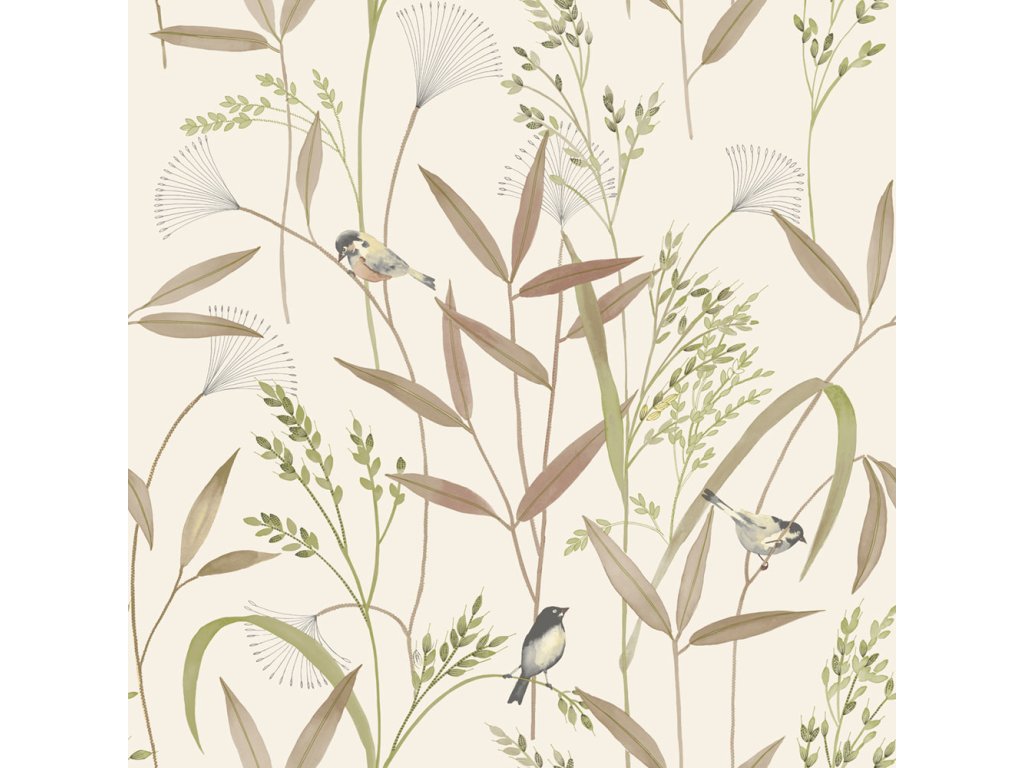 Vliesová tapeta s vinylovým povrchem, motiv lučních trav a ptáčků odstíny hnědo-béžové a zelené, krupičková textura.