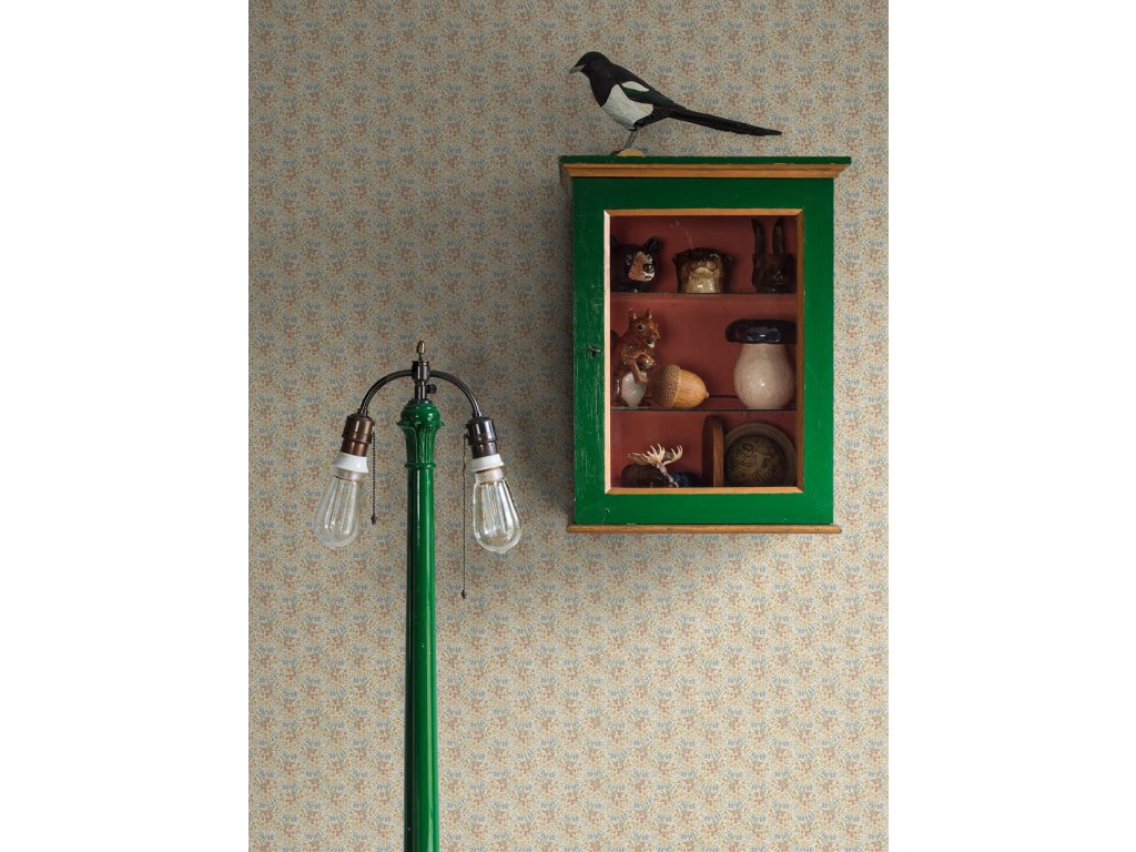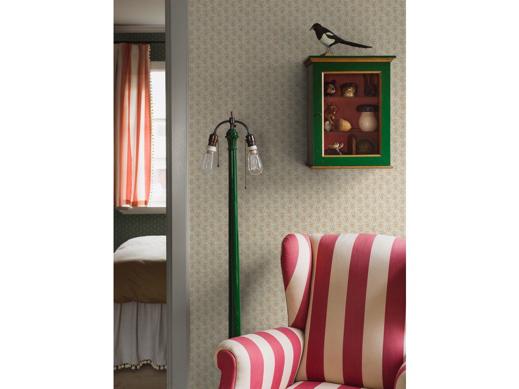 Vliesová tapeta na zeď, krémový podklad, drobný květinový vzor v odstínech béžové, růžové, žluté a modré.