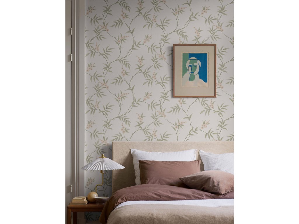 Vliesová tapeta na zeď, podklad krémový, rozkvetlé větvičky v odstínech zelené a pastelově růžové.