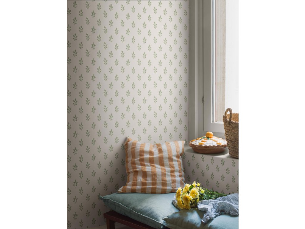Vliesová tapeta na zeď, vzor zelených listů na krémovém podkladu.