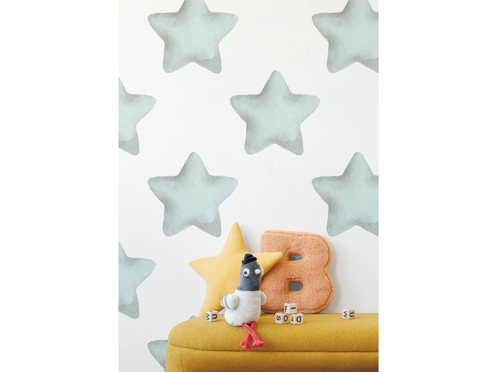 Vliesová tapeta na zeď, s jemnou strukturou, bílý podklad, modré hvězdy v průměru 30 cm.