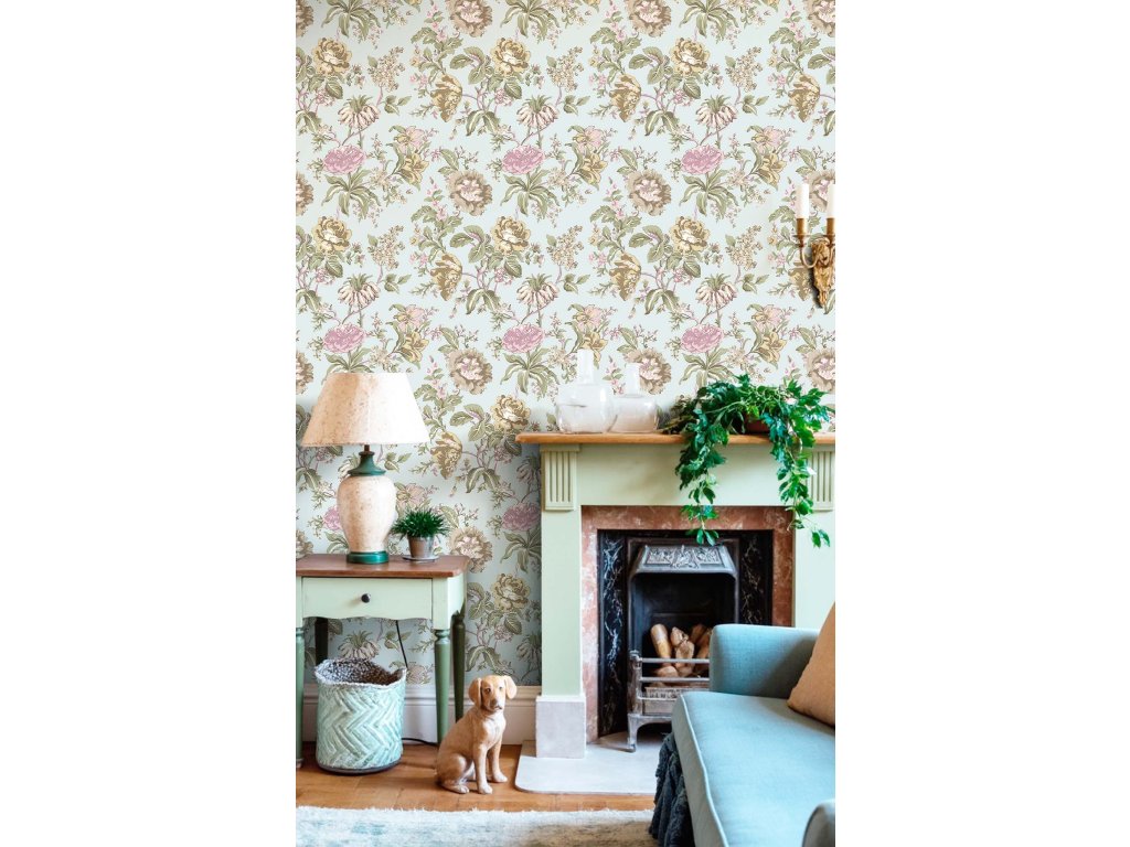 Luxusní vliesová tapeta s vinylovým povrchem, světle modrý podklad s látkovou texturou, květinový motiv v odstínech zelené, béžové a lila.