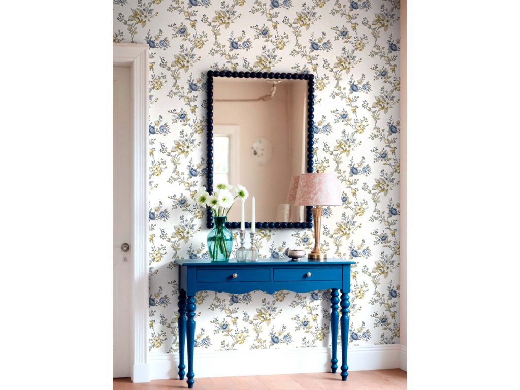 Luxusní vliesová tapeta s vinylovým povrchem, bílý podklad s látkovou texturou, romantický květinový motiv v odstínech modré, šedé a hnědé.