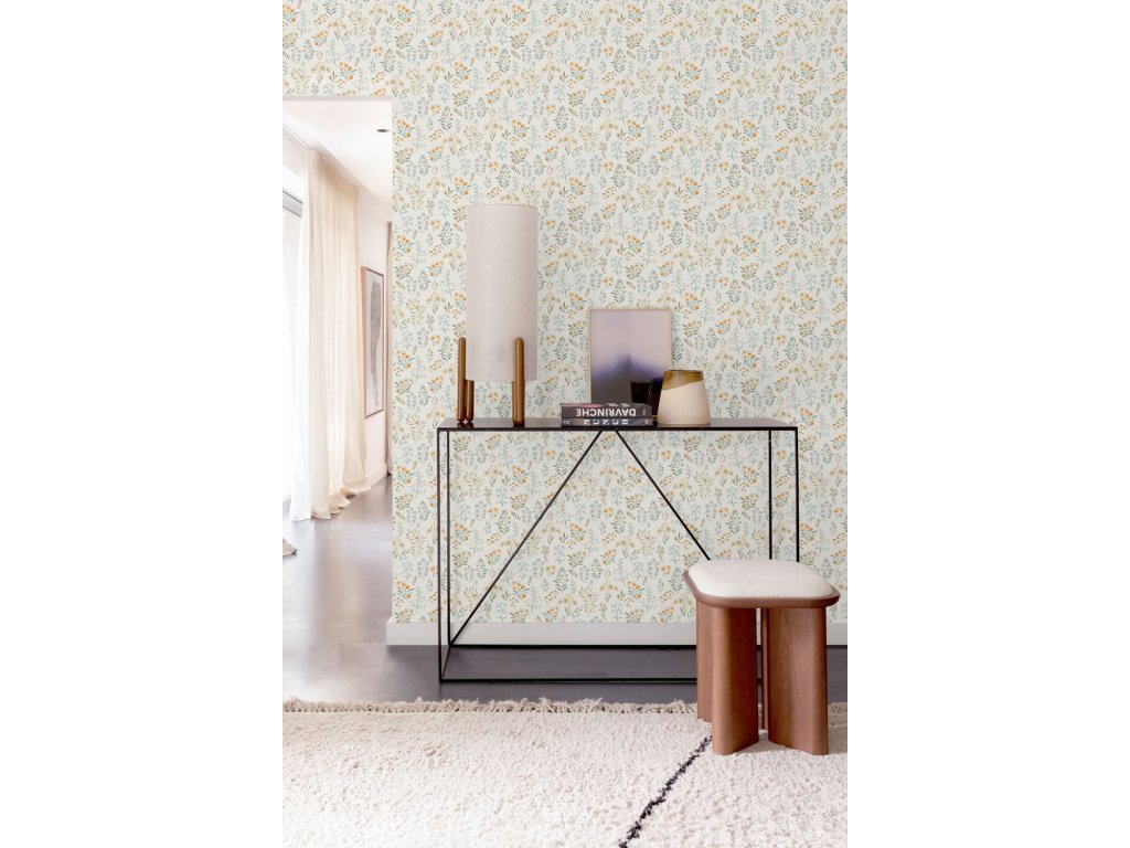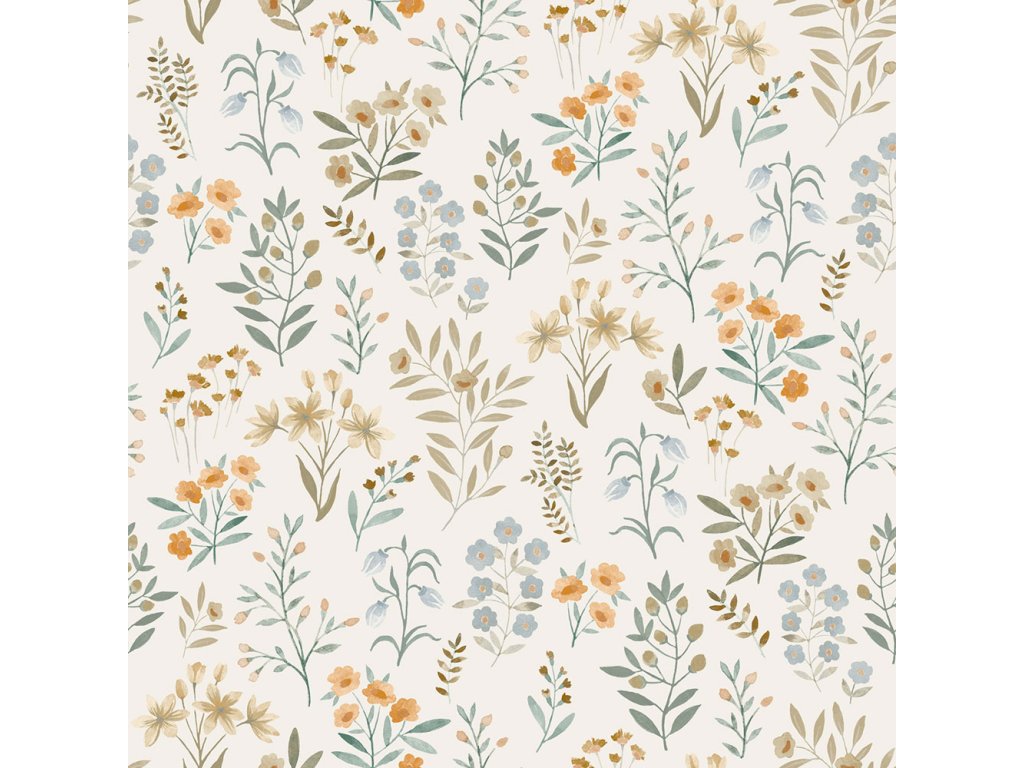 Vliesová tapeta s vinylovým povrchem, motiv květin v odstínech modré, béžové, hnědé a šedé, jemná textura.