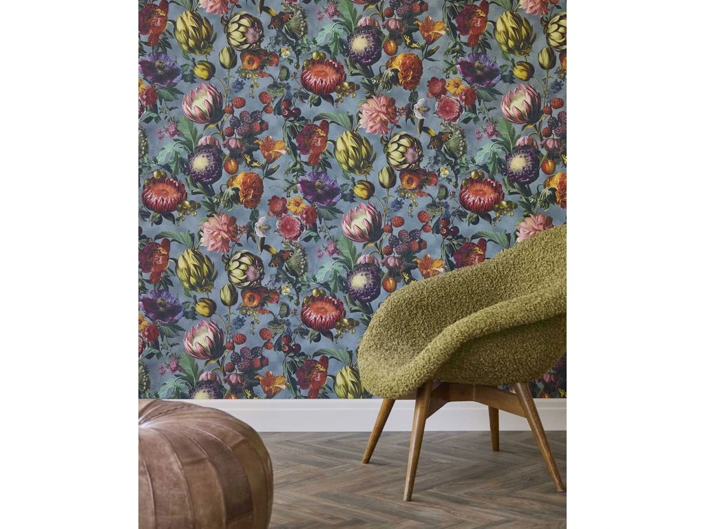 Vliesová tapeta na zeď, struktura plátna, pestrobarevný motiv květin, plodů a motýlů, podklad modrý.