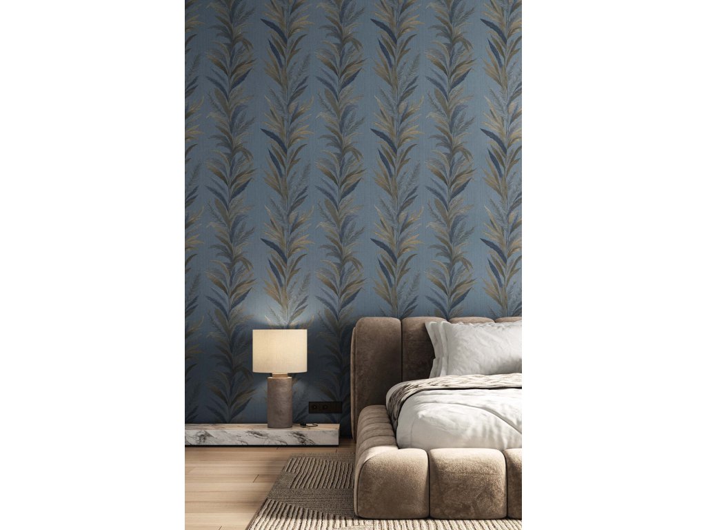 Vliesová tapeta s vinylovým povrchem, modrý proužkový podklad s motivy listů v kovově lesklých odstínech hnědo-zlaté, modré a šedo-modré.