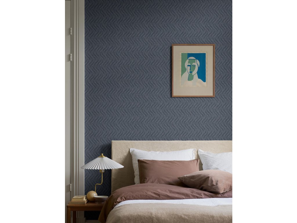 Jemně plastická vliesová tapeta na zeď, vzor stylizovaných listů kapradin v odstínech tmavě modré.