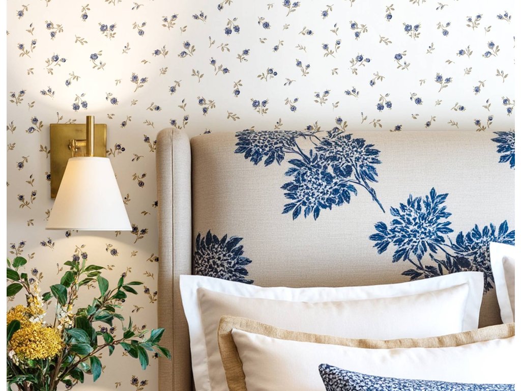 Luxusní vliesová tapeta s vinylovým povrchem, smetanově bílý podklad, drobné kytičky v odstínech modré a hnědé.