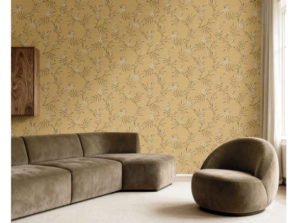 Luxusní vliesová tapeta s vinylovým povrchem, efekt jemné textilie s rozkvetlými větvičkami, okrový podklad, větvičky v odstínech hnědé, béžové a béžovo-bílé.