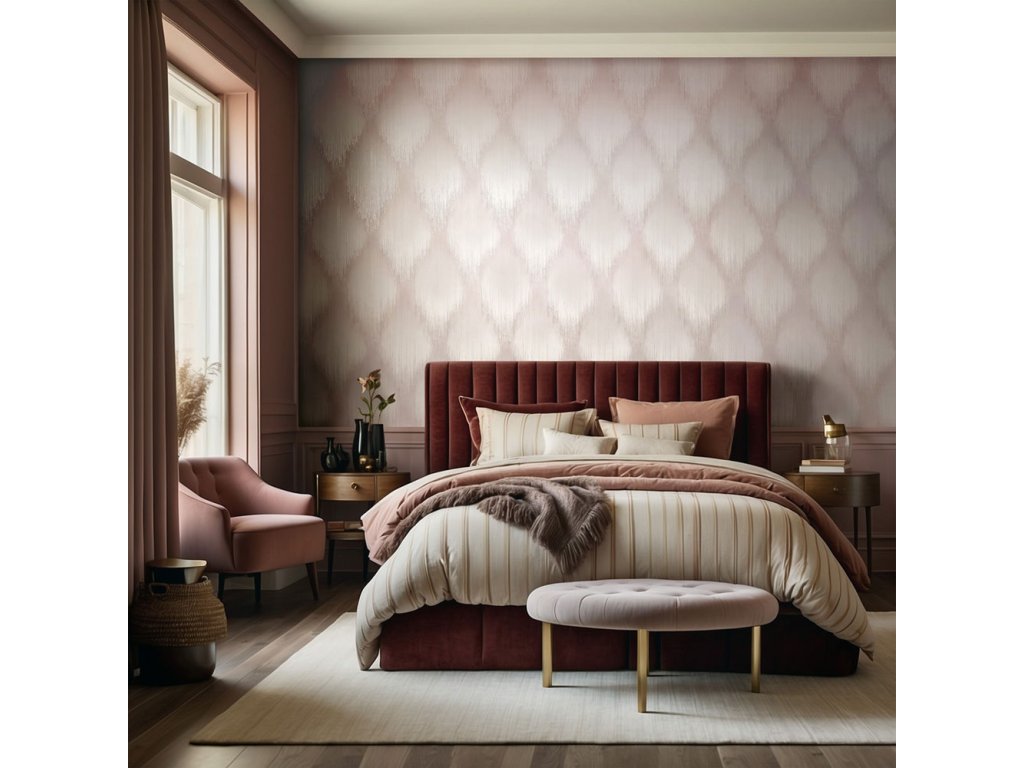 Vliesová tapeta s vinylovým povrchem, proužková textura v odstínech starorůžové, metalické odlesky vytváří grafický vzor.