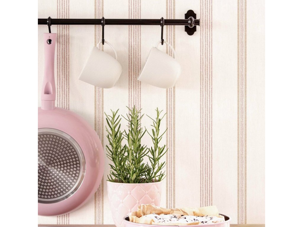 Vliesová tapeta s vinylovým povrchem, imitace proužkované látky v odstínech růžové a béžové.