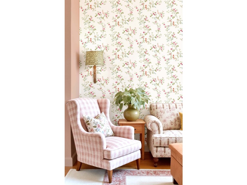 Luxusní vliesová tapeta s vinylovým povrchem, květinový motiv, látková textura, odstíny růžové a zelené.