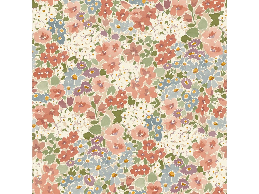 Vliesová tapeta s vinylovým povrchem, motiv pestrých květin, odstíny růžové, modré, fialové, červené a zelené, jemná textura.
