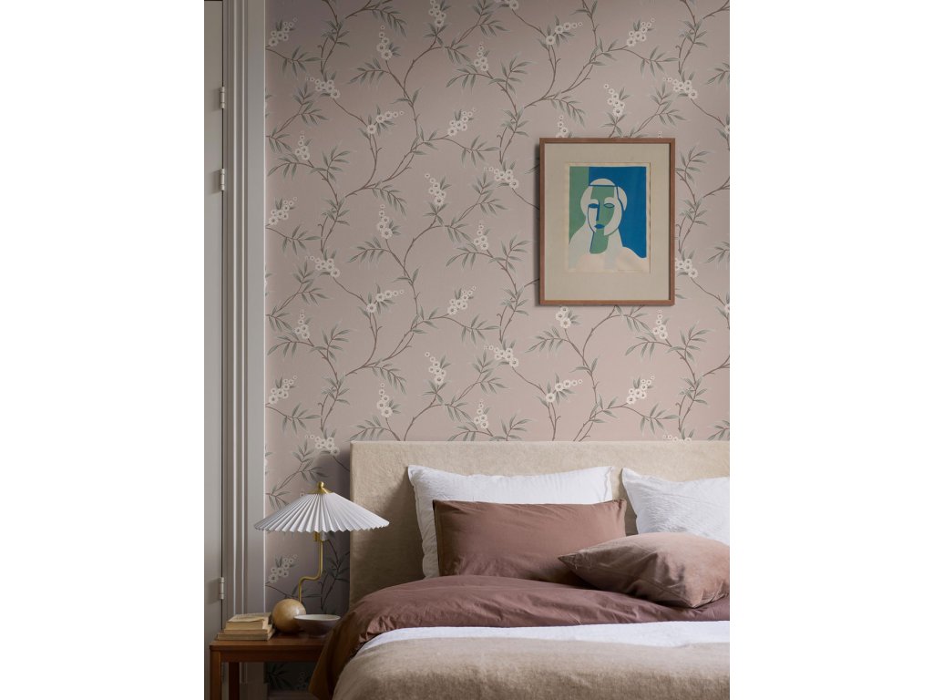 Vliesová tapeta na zeď, podklad růžový, rozkvetlé větvičky v odstínech zelené, hnědé, krémové a pastelově růžové.