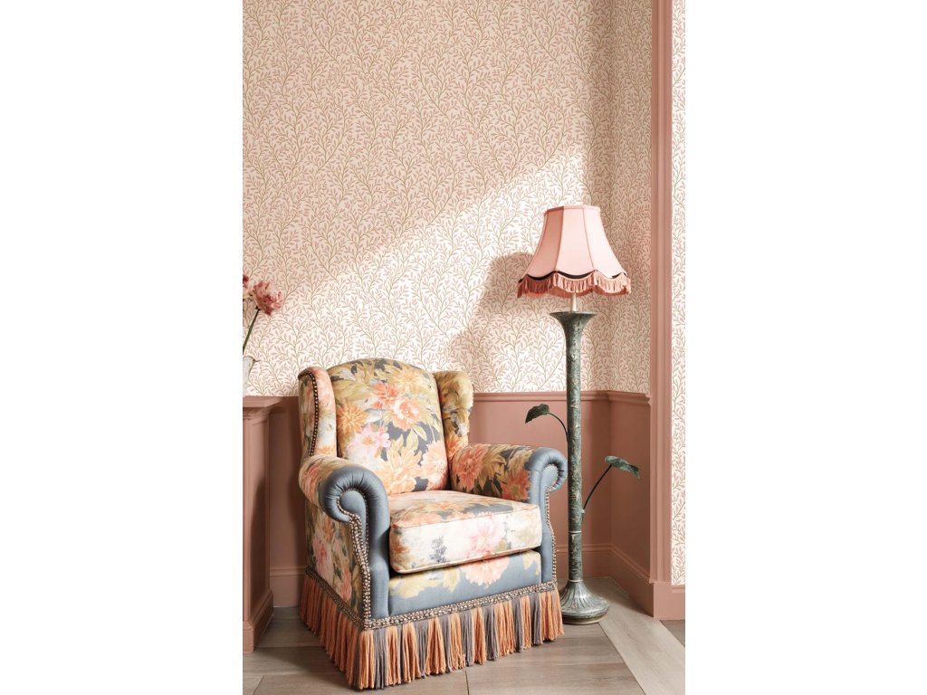 Luxusní vliesová tapeta s vinylovým povrchem, látková textura, motiv větviček s listy, odstíny růžové a béžové.