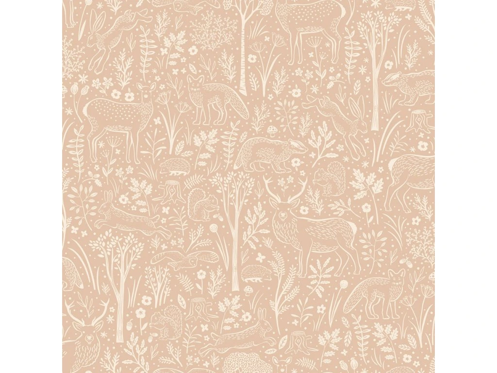 Vliesová tapeta na zeď, vzor lesních zvířátek, stromů a rostlin, odstíny růžové, vzhled a struktura látky.