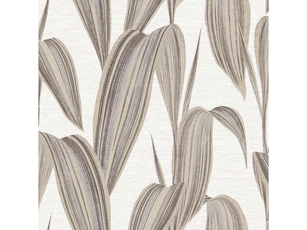 Luxusní vliesová tapeta s vinylovým povrchem, jemný strukturovaný povrch, listy, podklad v šedo bílé barvě, listy v kombinaci šedé a odstínech hnědé.