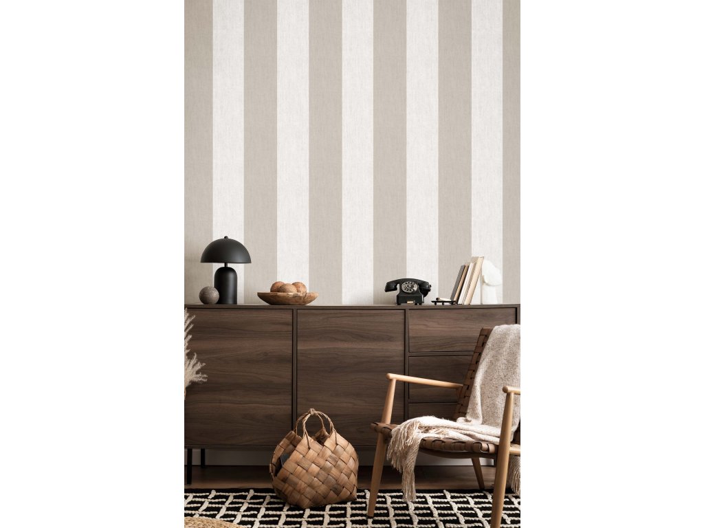 Vliesová tapeta s vinylovým povrchem, pruhy v odstínech šedé, látková textura.