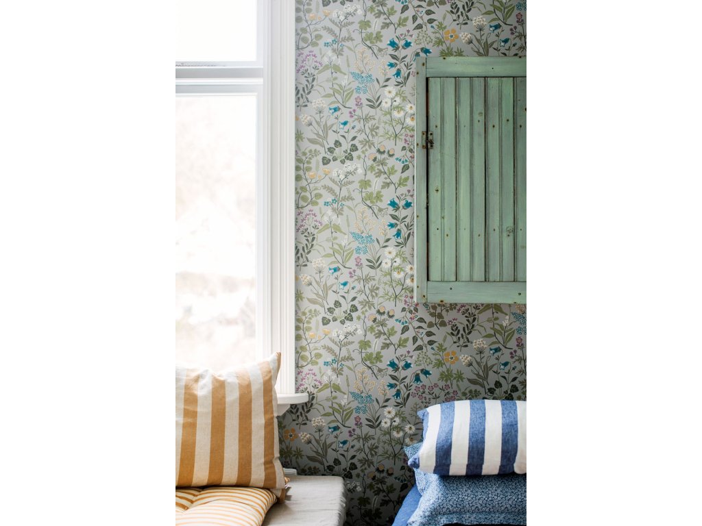 Vliesová tapeta na zeď, podklad šedý, vzor lučních květin v pestrých barvách