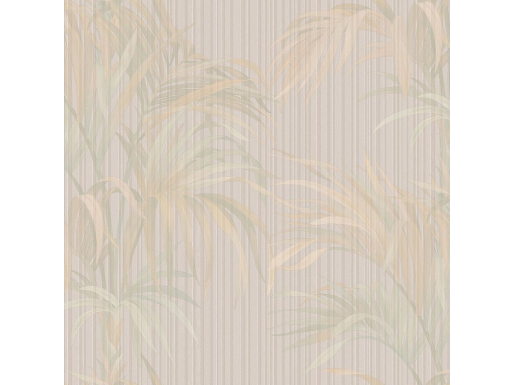 Luxusní vliesová tapeta na zeď s vinylovým povrchem, plastické pruhy a listy, šedý podklad, listy v odstínech zelené a žluté.