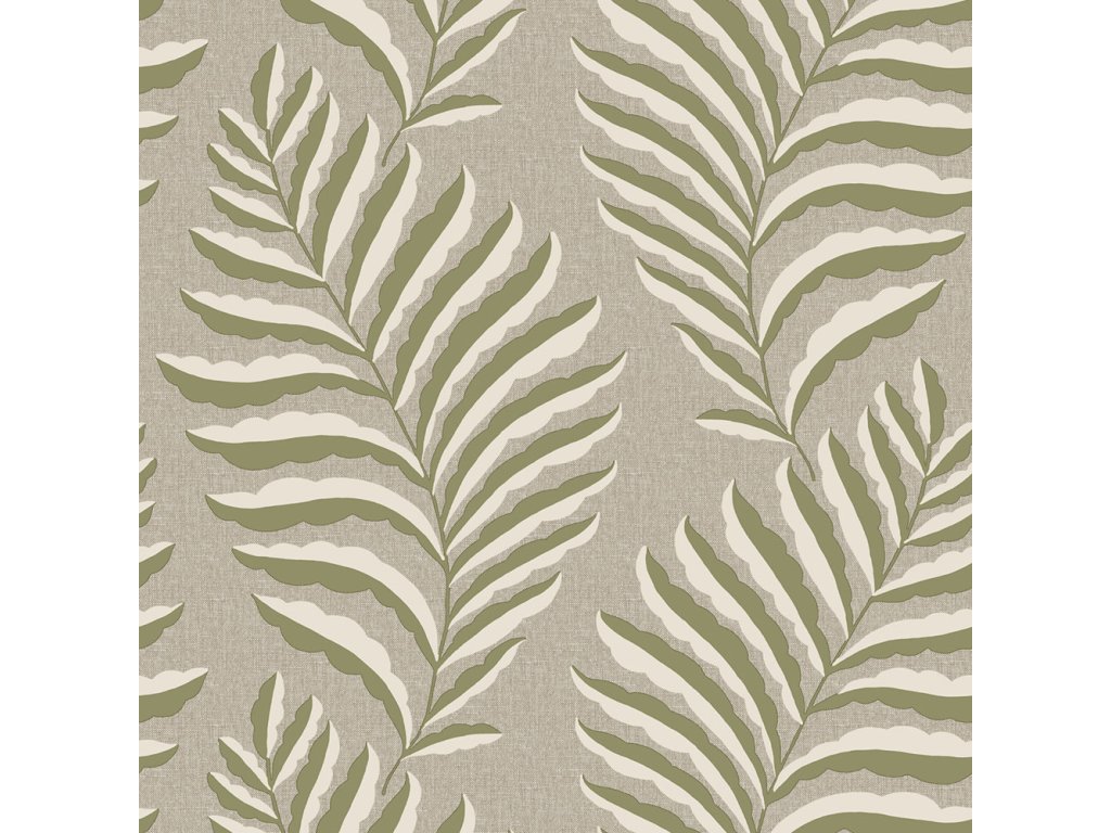 Vliesová tapeta s vinylovým povrchem, motiv listů v odstínech krémové a zelené, šedo-béžový podklad.