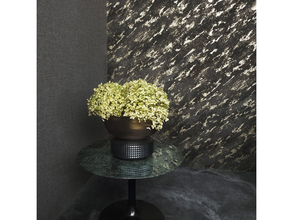 Vliesová tapeta s vinylovým povrchem, látková textura, šedo-černá melanž se zlatými a bronzovými akcenty.