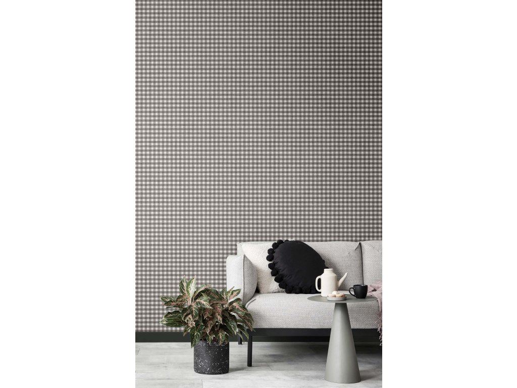 Vliesová tapeta s vinylovým povrchem, imitace kárované látky pepito v odstínech šedo-černé.