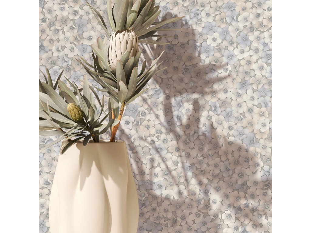 Vliesová tapeta s vinylovým povrchem, květinový vzor, odstíny šedo-modré a béžové, jemně plastická látková textura.