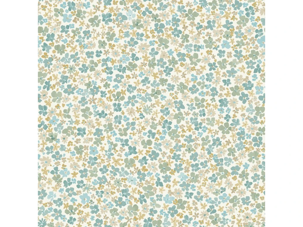 Vliesová tapeta na zeď, květinový vzor v odstínech tyrkysové, zelené, modré a okrově žluté, bílý podklad, vzhled a struktura látky.
