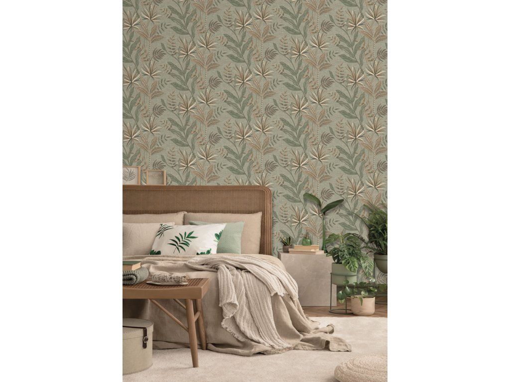 Vliesová tapeta s vinylovým povrchem, plastická textura, imitace látky, listy, podklad v kombinaci šedé a zelené, listy zelené, zeleno hnědé a hnědé.