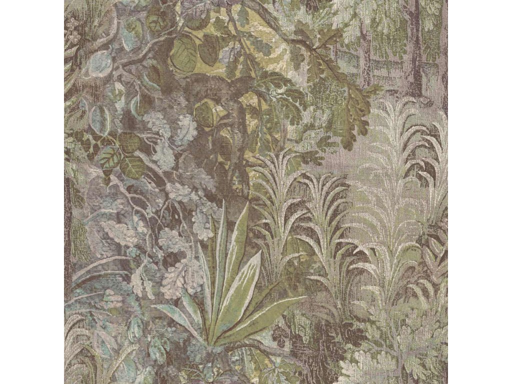 Luxusní vliesová tapeta s vinylovým povrchem, vzor evokuje textilii, rostlinné motivy, v kombinaci odstínů zelené, hnědé a šedé.