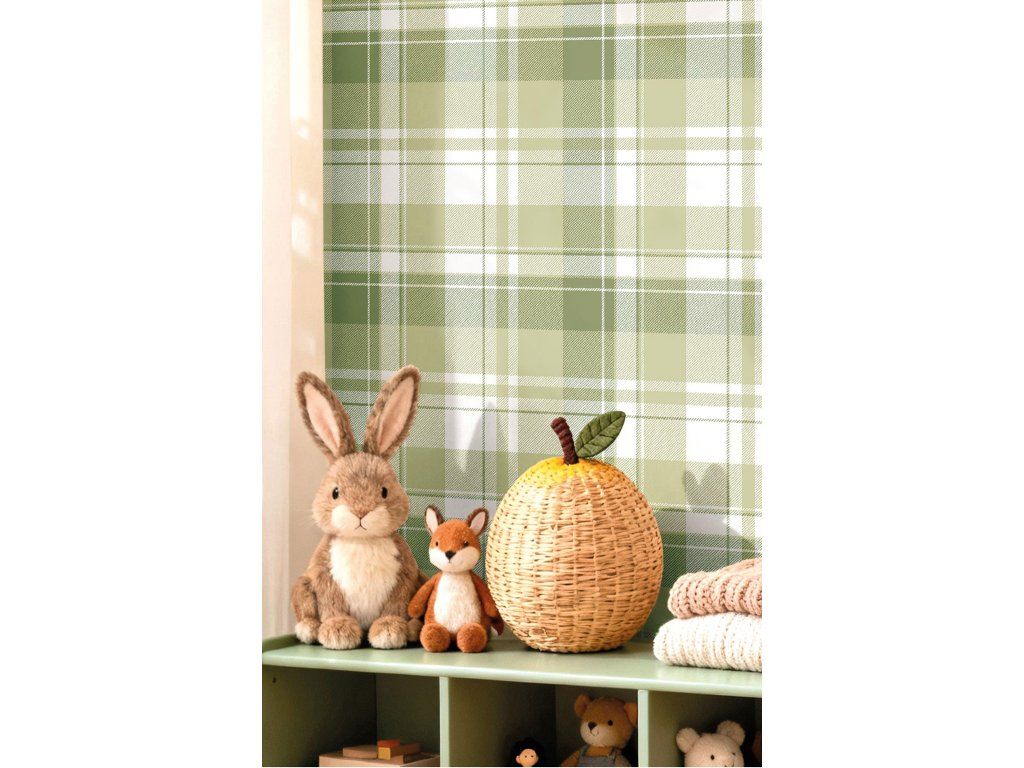 Vliesová tapeta na zeď, jemná textilní textura, imitace kárované látky v odstínech zelené a bílé.