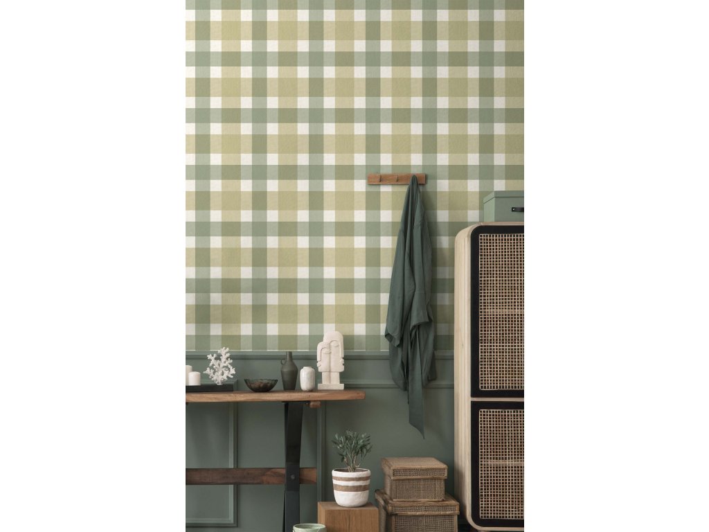 Vliesová tapeta s vinylovým povrchem, imitace kárované látky v odstínech zelené.
