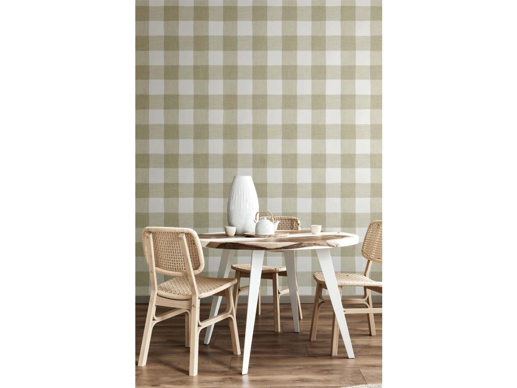 Vliesová tapeta s vinylovým povrchem, imitace kárované látky v odstínech zelené a bílé.