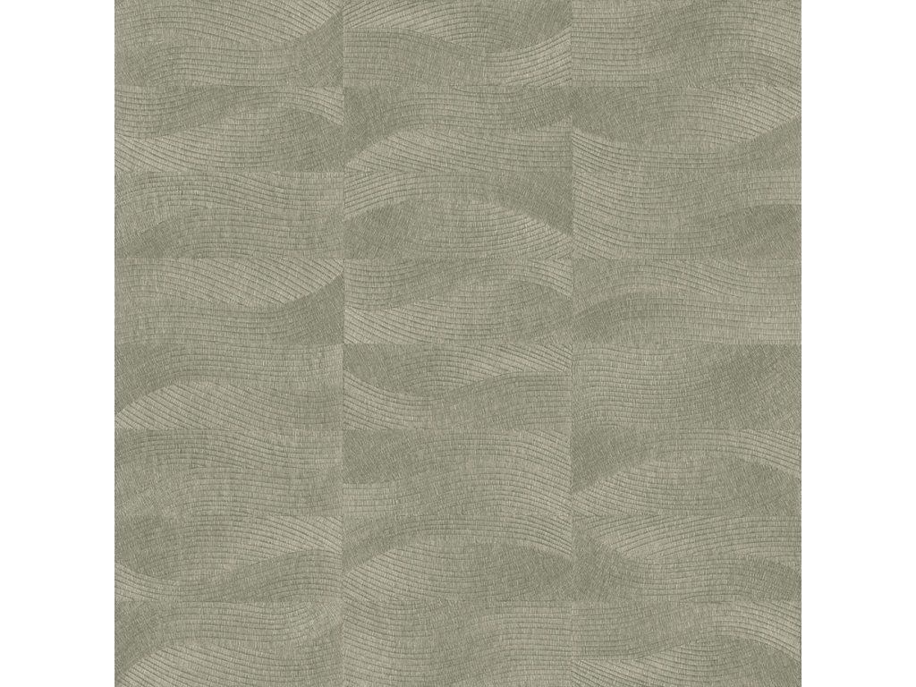 Vliesová tapeta s vinylovým povrchem, textura tkaniny, imitace výšivky, vlnky, vzor evokuje pruhy, odstíny zelené.
