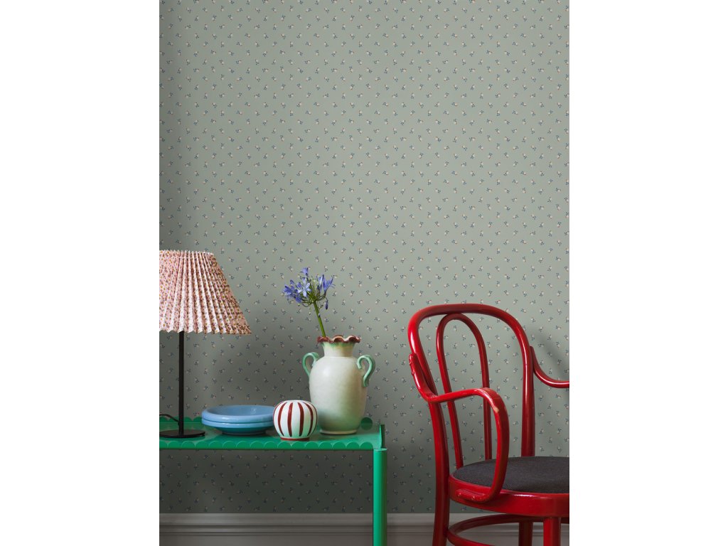 Vliesová tapeta na zeď, zelený podklad, motiv drobných kytiček v odstínech modré, červené a bílé.