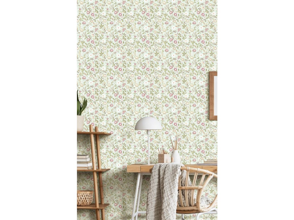 Luxusní vliesová tapeta s vinylovým povrchem, bledě zelený podklad, květinový motiv v odstínech starorůžové, zelené a okrové.