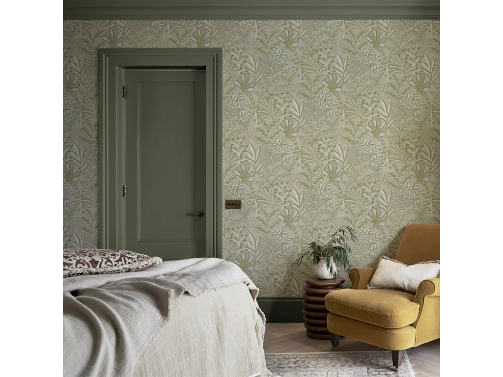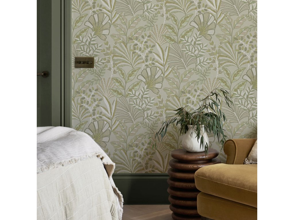 Vliesová tapeta na zeď, design inspirovaný výšivkami, odstíny zelené.