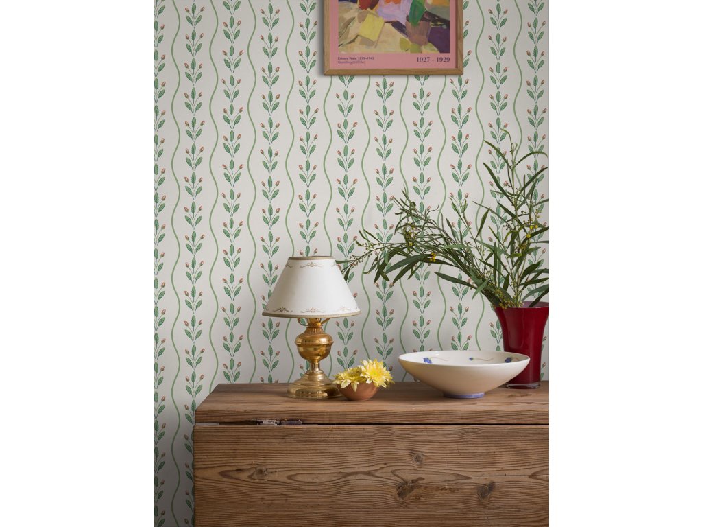 Vliesová tapeta na zeď, bílý podklad, zelené vlnkové linie tvoří pruhy; vzor listů a červených plodů.