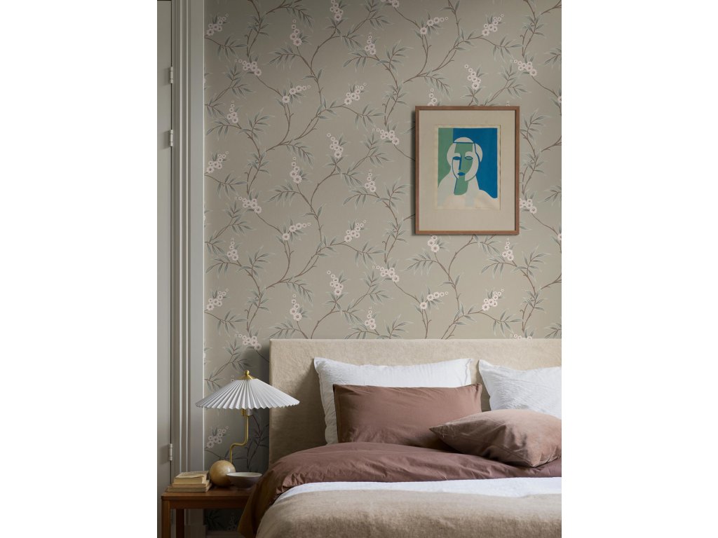 Vliesová tapeta na zeď, podklad světle zelený, rozkvetlé větvičky v odstínech zelené, hnědé, krémové a pastelově růžové.
