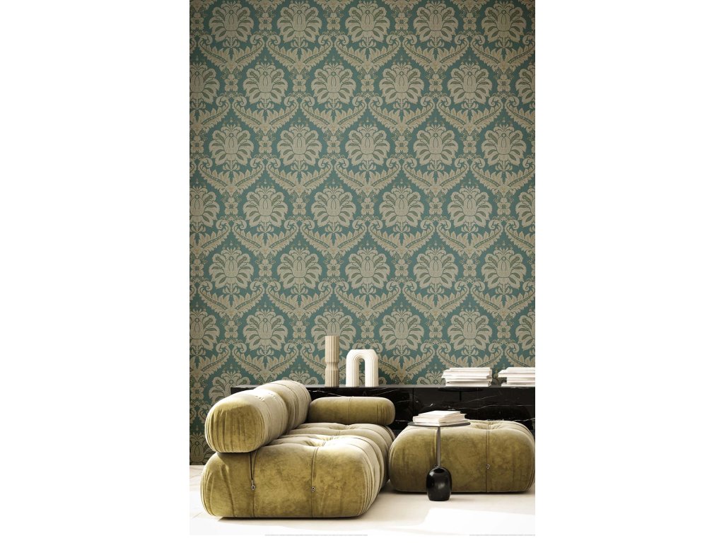 Vliesová tapeta s vinylovým povrchem, odstíny zelené a šedo-zelené, zámecký damaškový vzor s jemnými metalickými akcenty, textilní struktura.