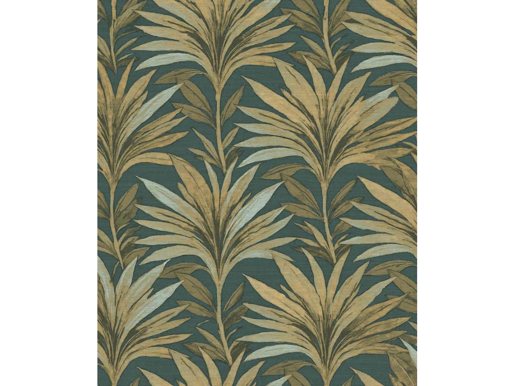 Luxusní vliesová tapeta s vinylovým povrchem, vzor evokuje textilii, listy, tmavě zelený podklad, listy v kombinaci zelené, žluté a šedé.