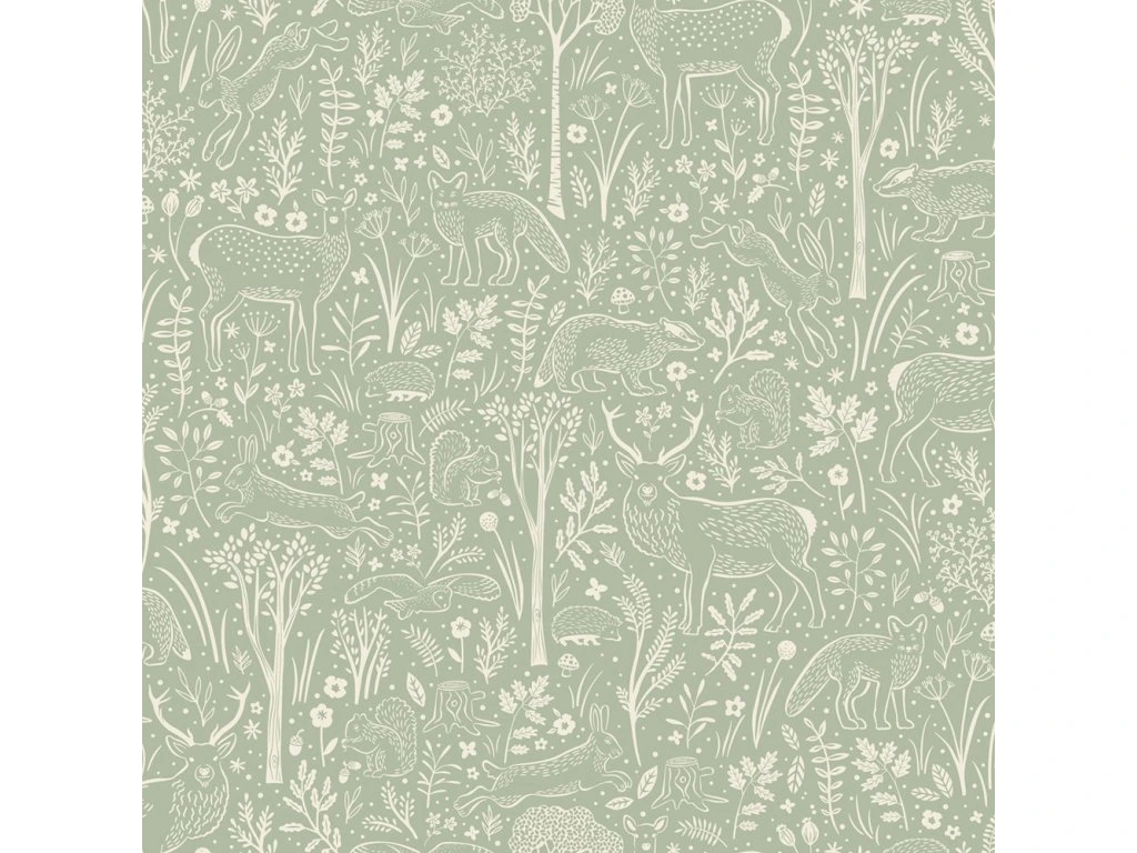 Vliesová tapeta na zeď, vzor lesních zvířátek, stromů a rostlin, vzhled a struktura látky.