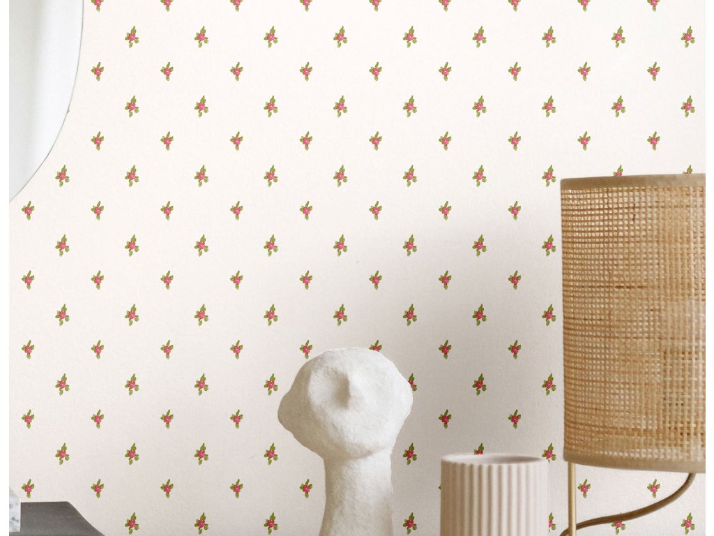 Luxusní vliesová tapeta s vinylovým povrchem, smetanově bílý podklad, drobné kytičky v odstínech zelené a růžové.