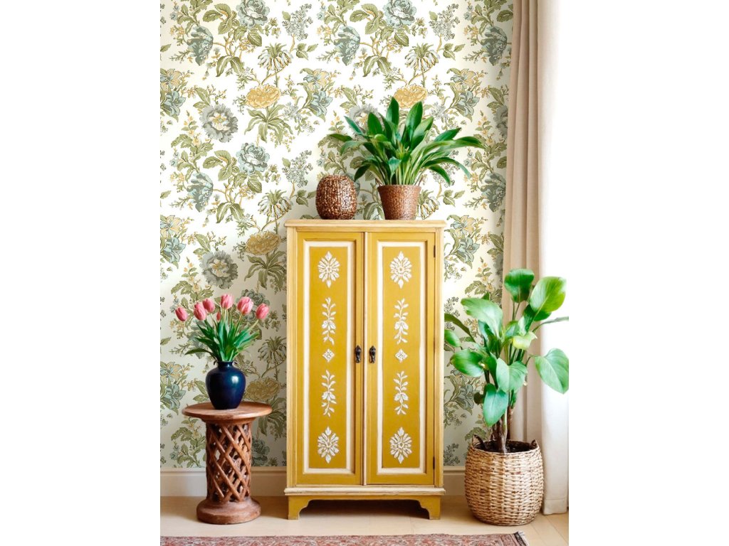 Luxusní vliesová tapeta s vinylovým povrchem, podklad s látkovou texturou, květinový motiv v odstínech zelené, modré a hnědo-béžové.