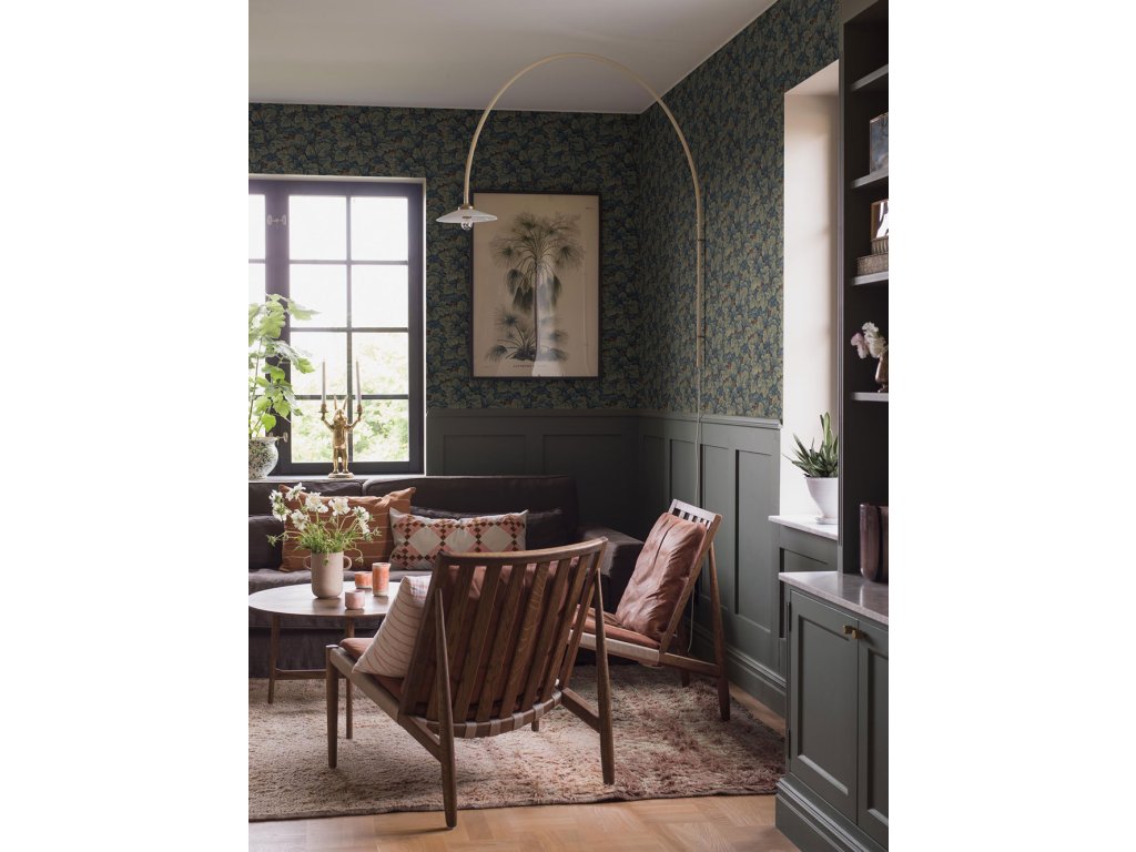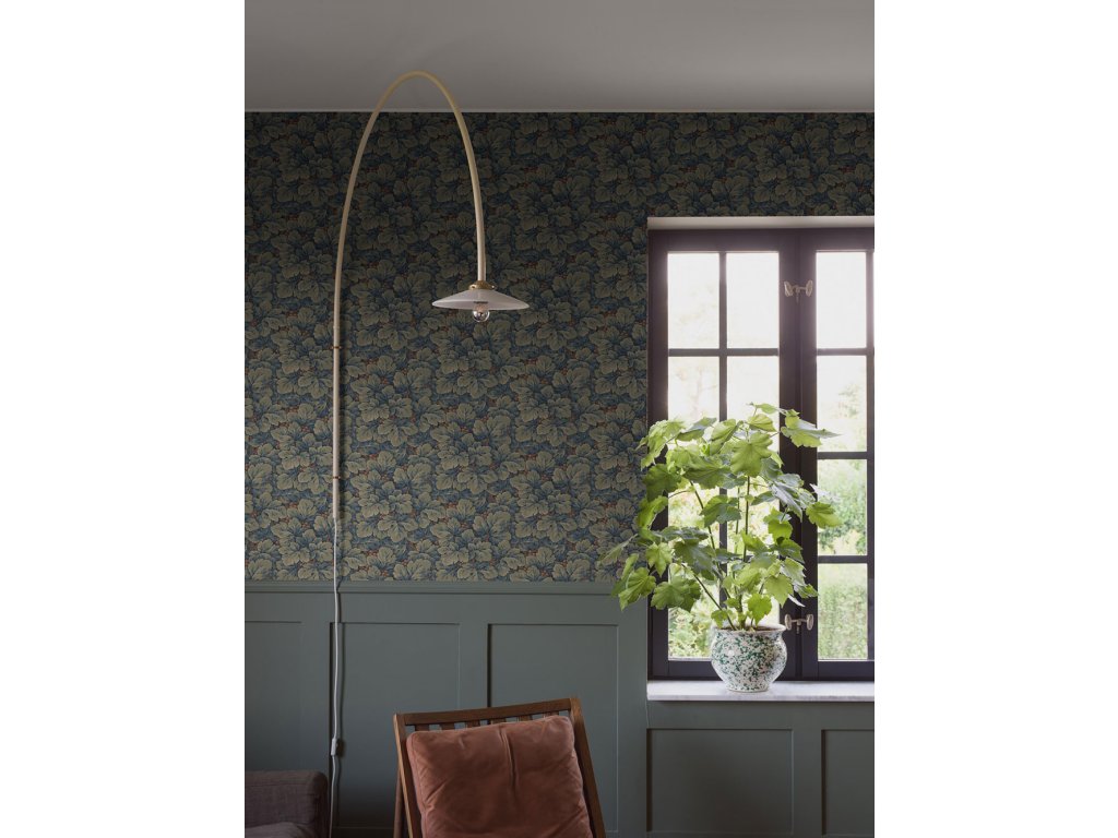 Vliesová tapeta na zeď - autentická replika z historického archivu, ztělesňuje přelom minulého století svým gobelínovým vzhledem - zelené listy na kostkované mřížce, jejichž hloubku umocňují modro-šedé stíny a oživují zlatavě hnědé detaily.