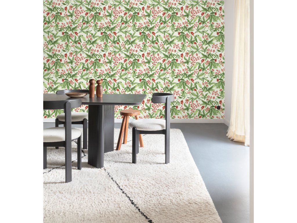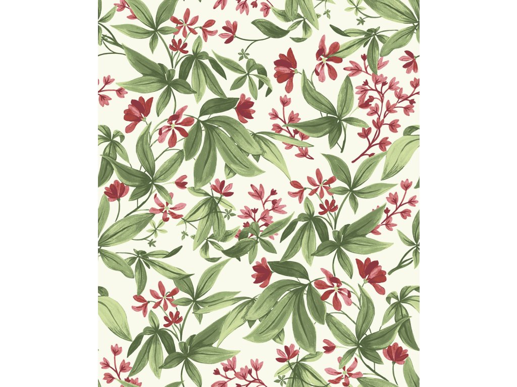 Vliesová tapeta s vinylovým povrchem, motiv rozkvetlých větviček v odstínech zelené a fuchsiové růžovo-fialové, jemná textura.