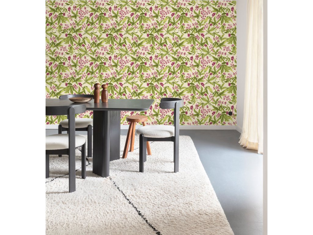 Vliesová tapeta s vinylovým povrchem, béžový podklad, motiv rozkvetlých větviček v odstínech zelené a fuchsiové růžovo-fialové, jemná textura.