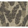 Luxusní vliesová tapeta na zeď s motivem větších banánových listů ve zlaté a tmavě hnědé barvě. Pozadí tapety je zlato-béžové s jemnou strukturou.
